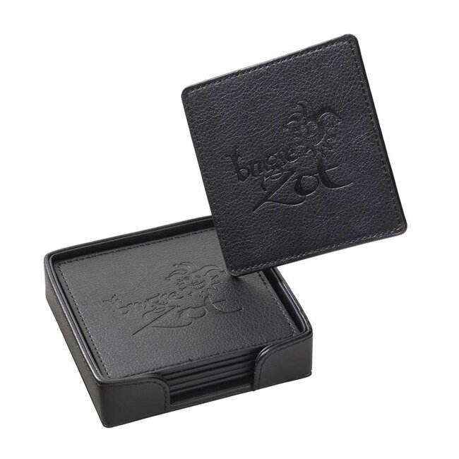 In a practical box of the same material are 6 coasters with the Brugse Zot emblem engraved on them.