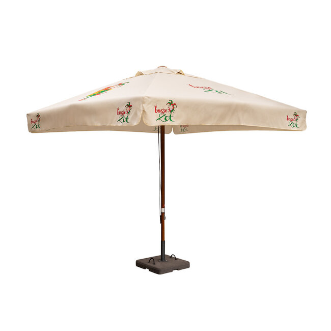 The one and only Brugse Zot parasol. Have a great time at home with this high-quality 200gr/m² polyester, water-repellent/water-proof parasol. No parasol base is included. This can be ordered in addition. Receive all information with your request for a quotation.